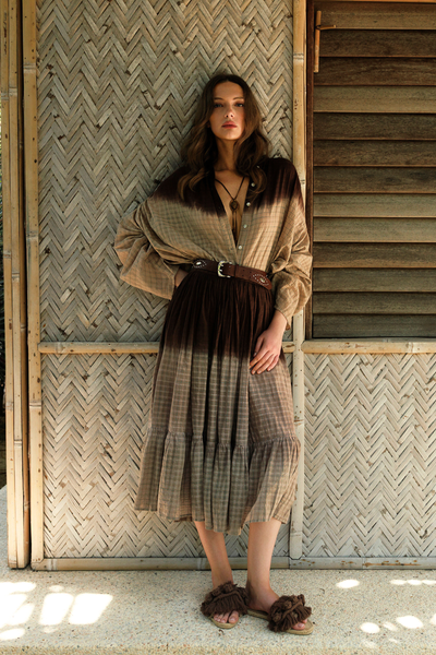 La jupe longue Himi en khadi coton cacao est tissée à la main dans la région du Bengale et ensuite, est teintée en plusieurs temps selon la technique du tie & dye, un procédé de teinture artisanal ou le tissu est noué, trempé puis teint à la main, créant des dégradés irréguliers.